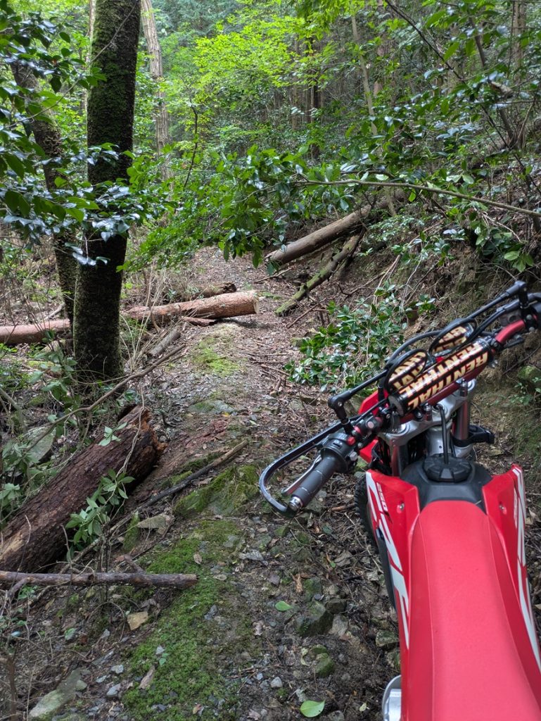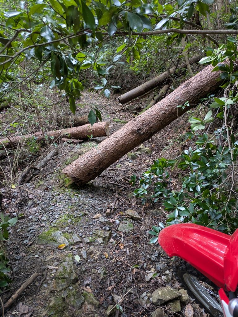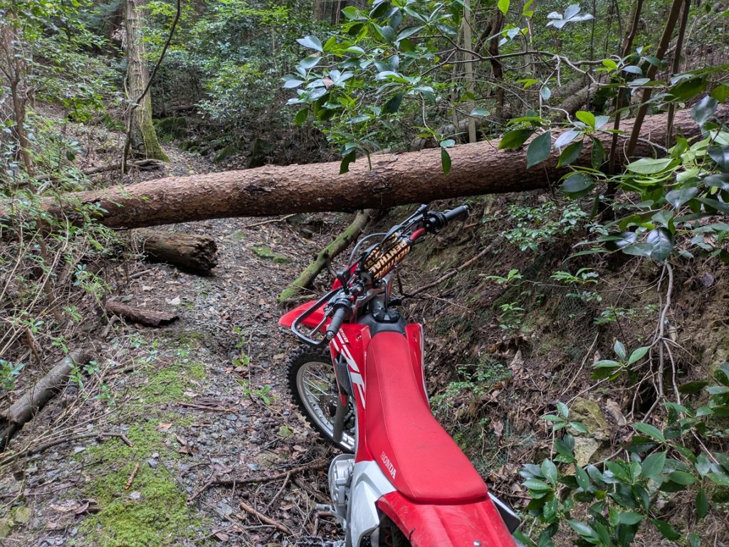 ここまでの太さの倒木はチェーンソー案件です。ただ今後この道を使う広島県民のため、刃渡り20cmのノコギリで撤去開始です。