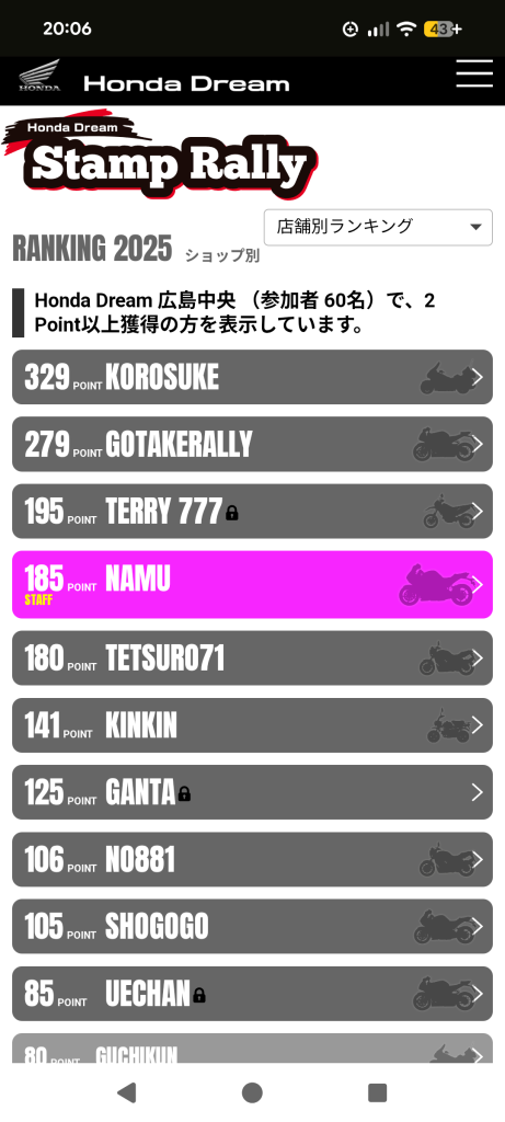 スタンプラリー途中経過です。スタンプラリーもいよいよ大詰めですが、いつの間にかトップ3から陥落しておりました。秋の絶好のバイクシーズン、初老のなきゃむらには後何回あるかわかりません。すぐにスタンプを押しに出発です。