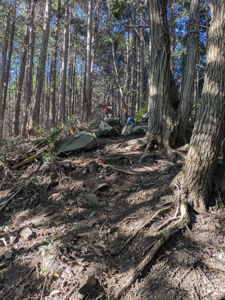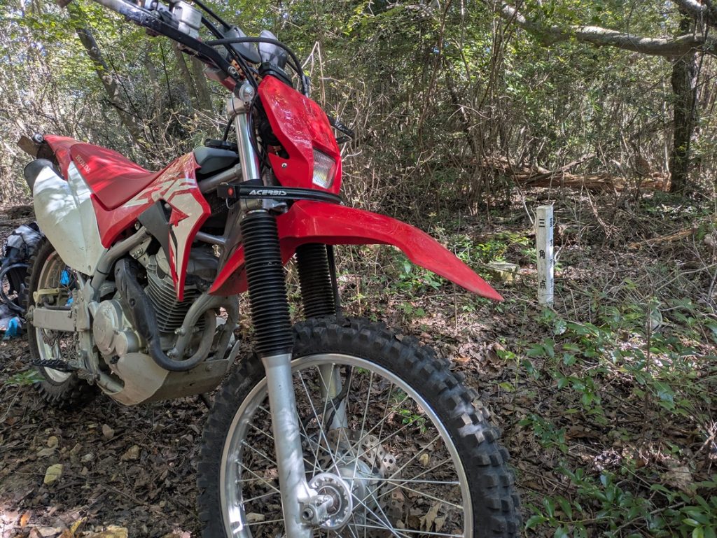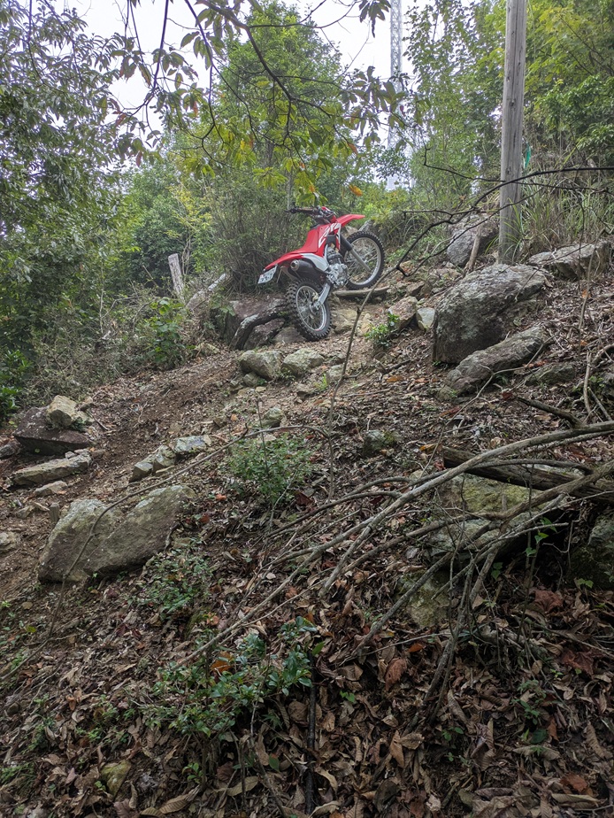 以前CRF450で登頂できなかった、木の根っこと岩のコラボヒルクライム。汗だくで今回はクリアー。ただ苦労してもご褒美は無し。頂上は見晴らしが悪く三角点があるだけでした…