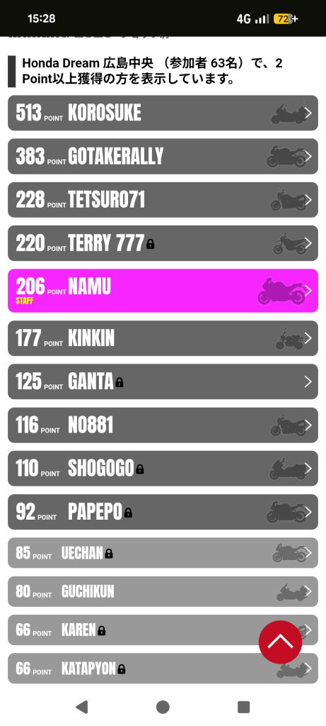 みなさんもこの11月、しっかりバイクを楽しんで下さい。以上なんとか3位に食い込みたいなきゃむらでした。