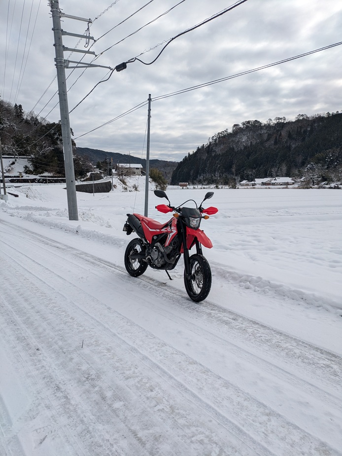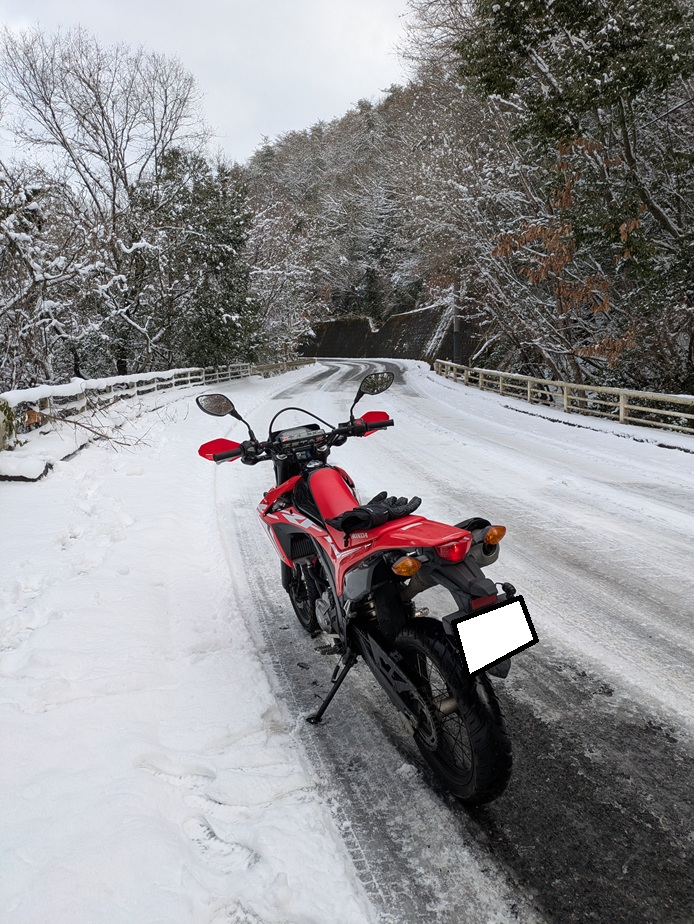 今回はオンロードバイクで北上。雪も泥も滑るのは一緒と安易に走っていますが、雪と言うよう氷です。