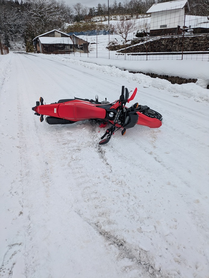 まあこうなります。転んですねを強打。あまりの痛さに戦意喪失で撤収です。今回はオンロード装備だったので、オフロード装備の安全性を確認することができました。みなさん、雪の日はバイクに乗るのは危険なので注意しましょう。