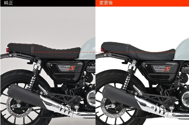 純正に近い形状ながらライダー部分のシート幅をスリムに。オリジナルシートベースを採用することで、純正シートベースでは不可能な足付き性を確保しました。ウレタン形状や表皮は純正シートの雰囲気に近づけることで、あからさまな「ローダウン感」を感じさせない仕上がりになっています♪