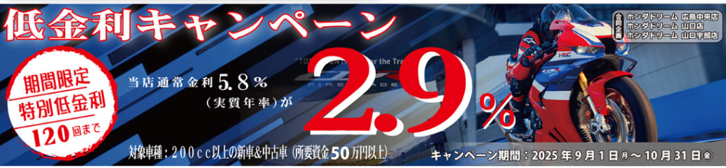 ~対象~ 所要資金50万円以上、200㏄以上の車両、支払回数120回までの方 ※160㏄以下、所要資金50万円以下の方は3.9%になります。