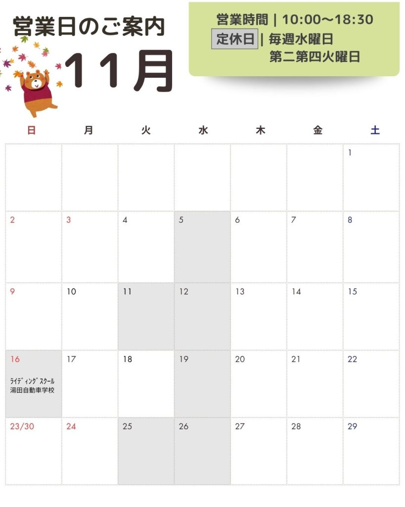 毎週水曜日、第2、第4火曜日が通常定休日です。通常定休日の他に11月16日(日)は湯田自動車学校で開催されるライディングスクールの為臨時定休日となっております。