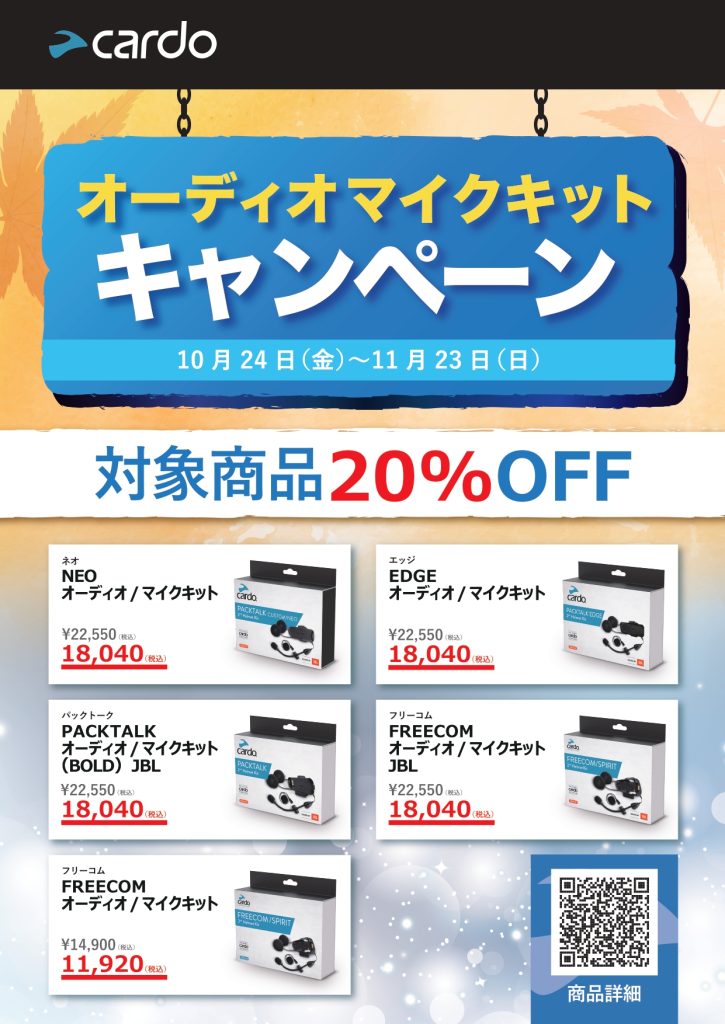 期間内に商品をご購入で20%オフです。普段Cardoのインカムをご使用されていて用途によってヘルメットを使い分けされている方にはオススメのキャンペーン!