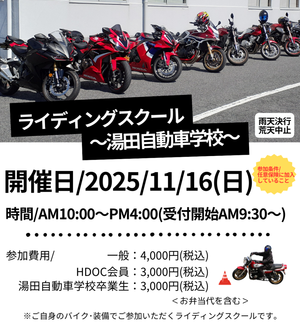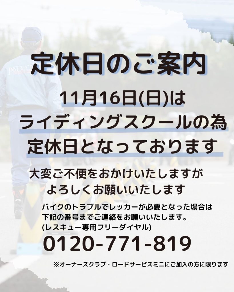 11月16日(日)はライディングスクールの為臨時定休日となっております。